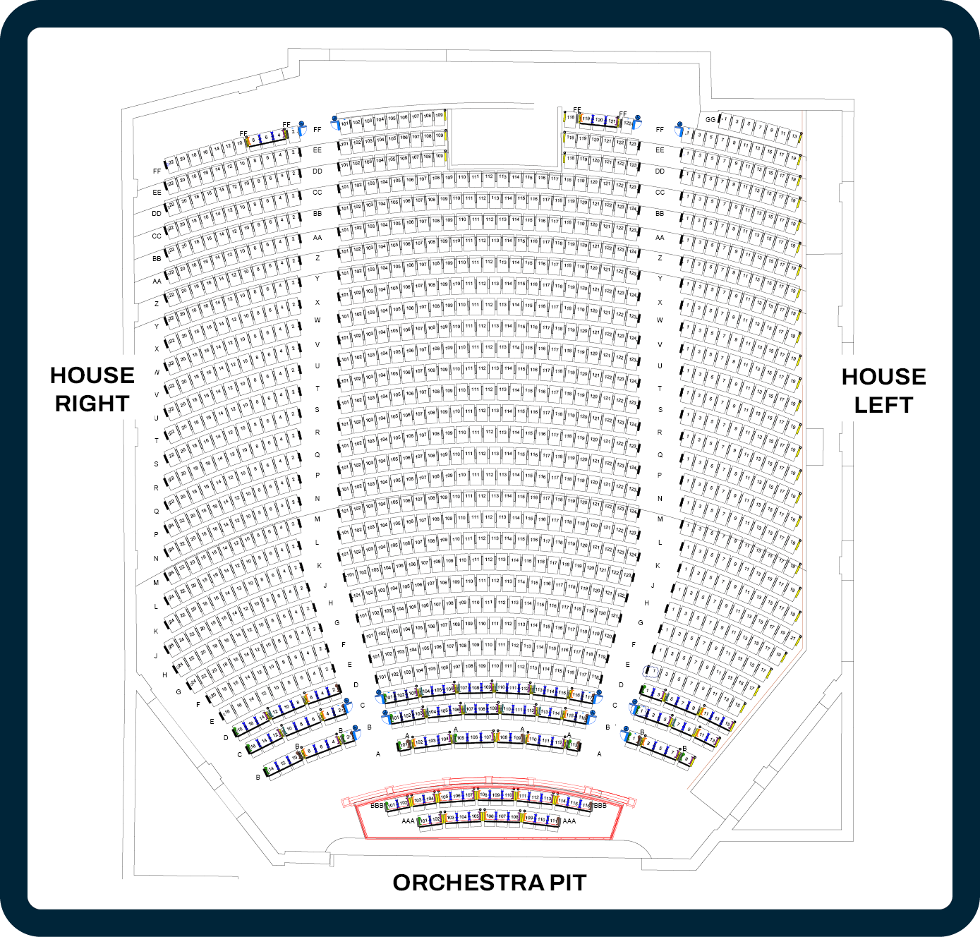 The interior of the auditorium now boasts several accessibility upgrades. In addition to new, uniform seats, the floor has been re-graded for a safer experience, especially for wheelchair users. Plus, we now have 12 wheelchair positions and 12 ADA designated positions. Railings and lighting will be installed in the aisles, and a house-left aisle has been designed with gentle grading for patrons with mobility concerns. And all restrooms are now on the main floor in the expanded lobby!